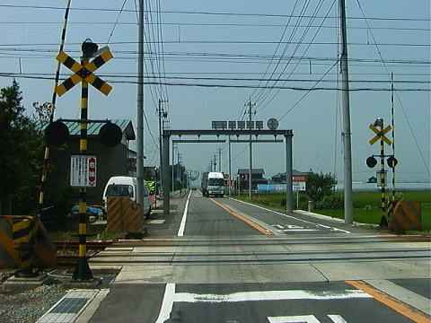 京福電鉄の踏み切り。このあと1つ目の信号を右折してください。
